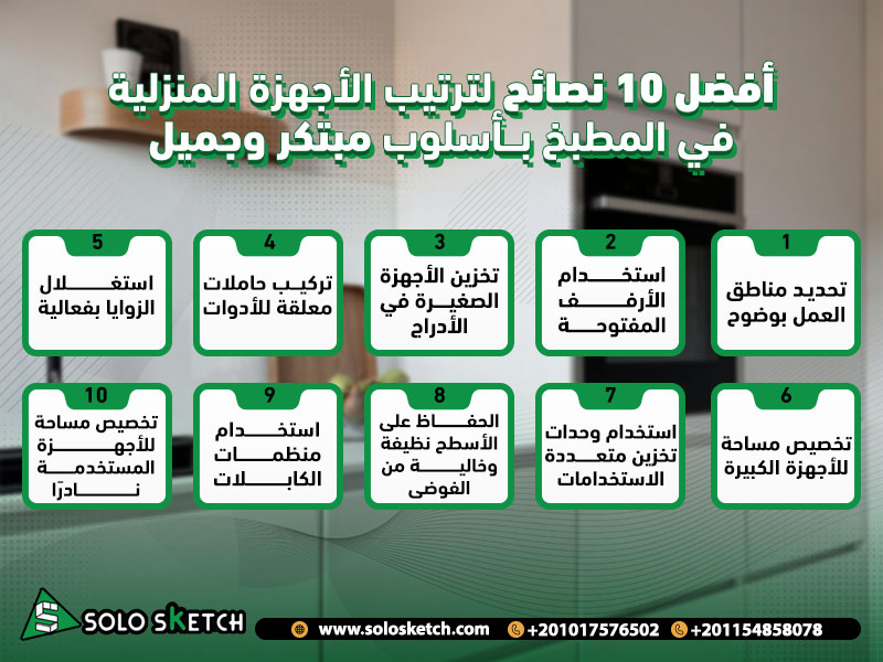 ترتيب الأجهزة المنزلية في المطبخ لا يقتصر على تحسين الشكل الجمالي فقط، بل يساعد أيضًا على تحسين الكفاءة وسهولة الاستخدام. من خلال اتباع النصائح التي استعرضناها، يمكنك تحويل مطبخك إلى مساحة مرتبة ومريحة. إذا كنت تبحث عن تصميم مبتكر وعملي لمطبخك باستخدام أحدث الخامات مثل Polylac، فإن شركة Solo Sketch هي الخيار المثالي لضمان الحصول على مطبخ أنيق وعملي يلبي كل احتياجاتك اليومية.